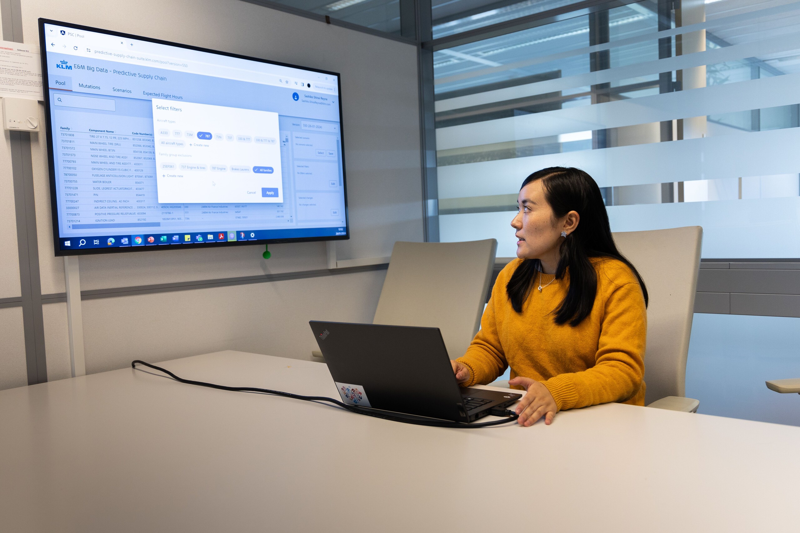 Datagedreven voorraadbeheer ‘Voorheen konden we redelijk voorspellen wanneer bepaalde onderdelen nodig zouden zijn’, begint Sashiko, analytics translator in het Big Data-team van Engineering & Maintenance (E&M). ‘Maar daarbij baseerden we ons vooral op schattingen, eigen ervaringen en de beloftes van fabrikanten. Dankzij de opkomst van big data kan dat veel slimmer en realistischer. We houden precies bij hoelang onderdelen het volhouden: hoeveel tijd, maar ook hoeveel vluchten, vliegmeters of keren dat ze gebruikt kunnen worden – denk aan een koffiemachine die gemiddeld 10.000 koppen zet. Hier nemen we bovendien ook klimatologische factoren in mee: een vliegtuigmotor draait minder lekker als-ie veel in zanderige of ijskoude omgevingen komt.’ Een aantal jaar geleden kochten we voor de zekerheid vijf stuks van iets, daar bleven er drie van op de plank liggen. Nu wéten we dat er maar twee van nodig zijn. Sashiko weet precies wat een vernieuwing als de predictive supply chain (PSC) betekent voor haar collega’s. ‘Als analytics translator sta ik tussen de business en de ontwikkelaars in. Ik spreek de supplychainspecialisten regelmatig en hoor van hen waar ze behoefte aan hebben, dat vertaal ik – samen met de product owner – naar technische requirements. En als de oplossing is ontwikkeld, presenteer ik deze aan collega’s op de vloer en zorg ik ervoor dat ze ermee kunnen werken, bijvoorbeeld door workshops te organiseren.’ ‘De meeste collega’s zijn vooral heel blij met de slimmere manier van werken’, gaat Sashiko verder. Toch gaat het niet altijd soepel: soms werken mensen verandering een beetje tegen, in de meeste gevallen onbewust. ‘Ik vind dat helemaal niet gek. Veel mensen binnen E&M werken er al jaren en doen hun ding al die tijd hetzelfde. Dan is het even wennen als er nu collega’s komen die hun werk veranderen. Maar uiteindelijk werkt een oplossing alleen als iedereen ermee werkt. Ik vind het een leuke uitdaging om teams aan boord te krijgen en ze te laten ervaren hoe het hun werk vergemakkelijkt. Daarom werken we veel met key users: representatieve collega’s die onze oplossingen uitgebreid testen.’ Eindeloze datamogelijkheden De oplossing van Sashiko en haar collega’s helpt dus om grip te krijgen op de onderdelenvoorraad. Maar zowel de tool als de data erachter kan nog zo veel meer bieden. Sashiko somt op: ‘Onderhoudshandleidingen bijstellen en up-to-date houden bijvoorbeeld, of voorkomen dat onderdelen te veel kilometers moeten afleggen tussen onze Schiphol-locatie en buitenstations. Maar ook beter voorspellen wanneer onze Component Shops het druk krijgen, inzicht krijgen in de effecten van klimatologische omstandigheden op verschillende componenten, bepalen wanneer we claims bij fabrikanten kunnen indienen omdat garanties van fabrikanten structureel onrealistisch blijken. Lang verhaal kort: er ligt nog een hoop werk voor ons!'