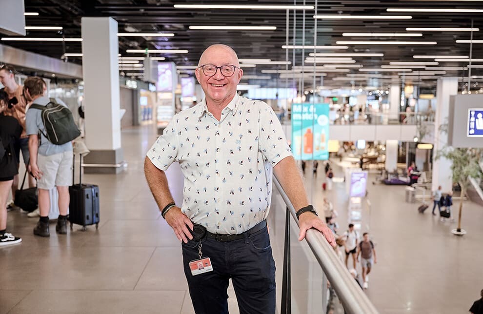 Henk en zijn collega's zijn altijd aanspreekbaar, ook voor reizigers. Tijdens hun rondes in de terminal dragen ze vaak een oranje hesje, waardoor ze makkelijk herkenbaar zijn. Heb je iets nodig of is er een probleem? Aarzel dan niet om hen aan te spreken!