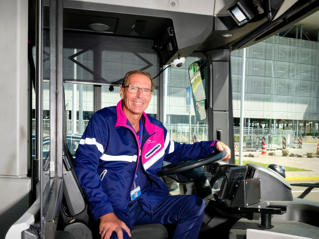 Mike vertelt: “Met mijn collega’s vervoer ik dagelijks passagiers van zo’n 35 gates naar bijna 45 vliegtuigopstelplaatsen. Dat doen we vanaf bijna alle pieren voor verschillende luchtvaartmaatschappijen.